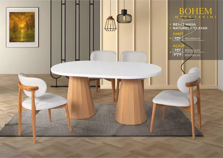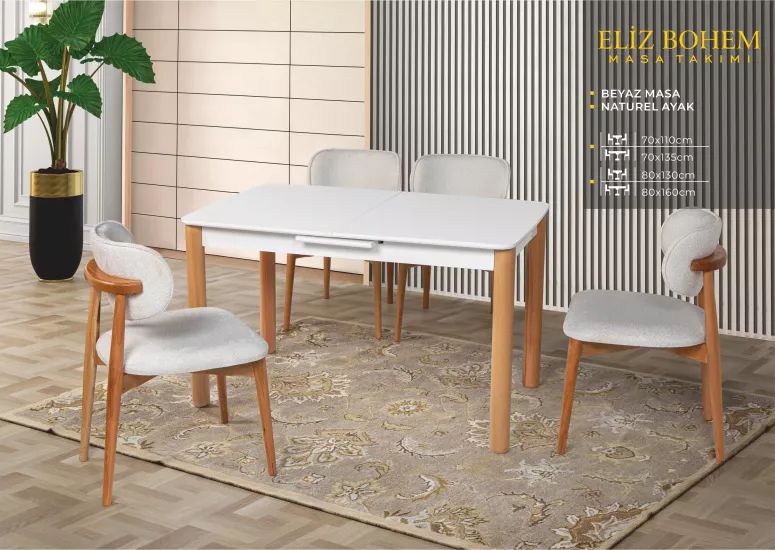 ELİZ BOHEM MASA, UMAY SANDALYE, BEYAZ, NATURAL