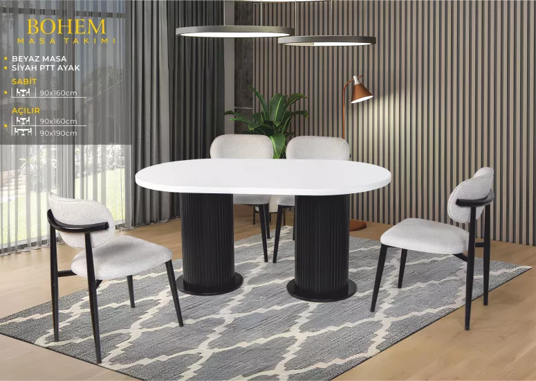BOHEM MASA, UMAY SANDALYE, BEYAZ, SİYAH, FIÇI AYAK