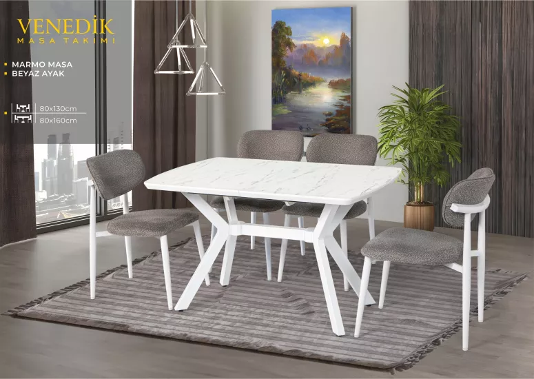 VENEDİK MASA, UMAY METAL SANDALYE, MARMO, BEYAZ