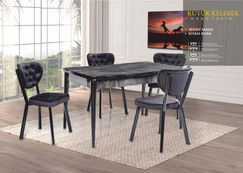 KÜTÜK KELEBEK MASA, RİVONE SANDALYE, İRONY, SİYAH