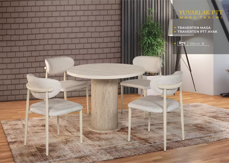 YUVARLAK PTT MASA, UMAY METAL SANDALYE, TRAVERTEN