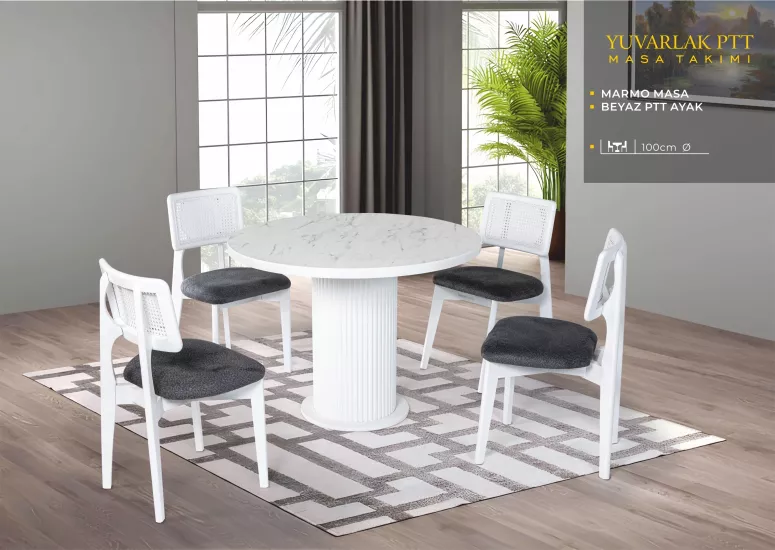 YUVARLAK PTT MASA, ZİON SANDALYE, MARMO, BEYAZ